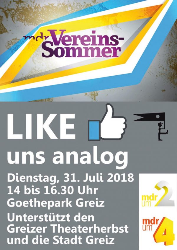 Am Dienstag, 31. Juli 2018, besucht das mdr-Fernsehen, von 14 bis 16.30 Uhr, den Greizer Theaterherbst und die Stadt Greiz im Rahmen des mdr-Vereinssommers. Von den zehn ausgewählten, mitteldeutschen Vereinen erhält derjenige eine Prämie, der die meisten Zuschauer mobilisiert Bitte… Weiterlesen →