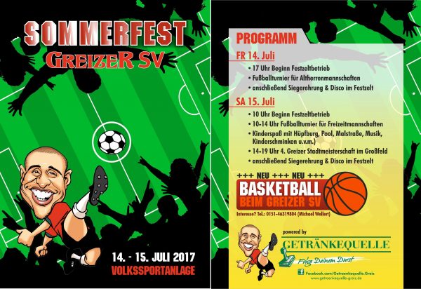 Freitag, 14.07. 17:00 Uhr Beginn Festzeltbetrieb Fußballturnier für Alte-Herren-Manschaften Anschließen Siegerehrung & Disco Samstag, 15.07. 10:00 Uhr Beginn Festzeltbetrieb 10.00 bis 14:00 Uhr Fußballturnier für Freizeitmanschaften Kinderspaß mit Hüpfburg, Pool, Malstraße, Musik, Kinderschminken usw.) 14:00 bis 19:00 Uhr 4. Greizer… Weiterlesen →
